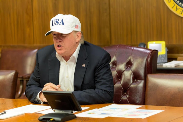 | President Biden showing off his new Camp David hat that his family gave him for Presidents' Day |